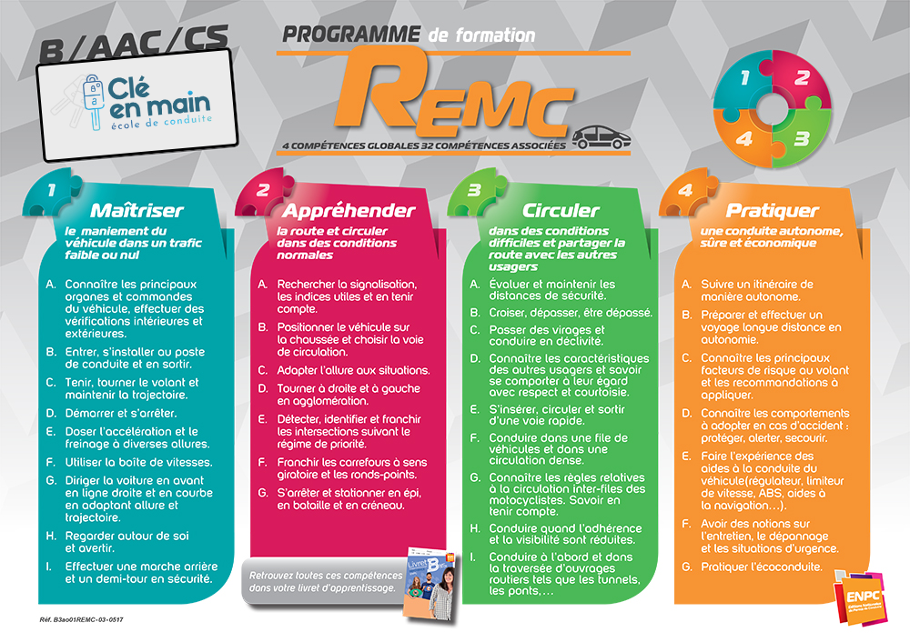 L’objectif général est d’amener tout automobiliste débutant à la maîtrise de compétences en termes de savoir être, savoirs, savoir-faire et savoir devenir. Apprendre à conduire est une démarche éducative exigeante. Le programme de formation se veut une vue d’ensemble des compétences qu’un conducteur responsable doit acquérir pour ne pas mettre sa sécurité et celle des autres en danger. Il vous faudra prendre conscience que ce qui est appris en formation doit progresser et évoluer, après l’obtention du permis de conduire, en tenant compte des mêmes objectifs sécuritaires que lors de votre apprentissage.